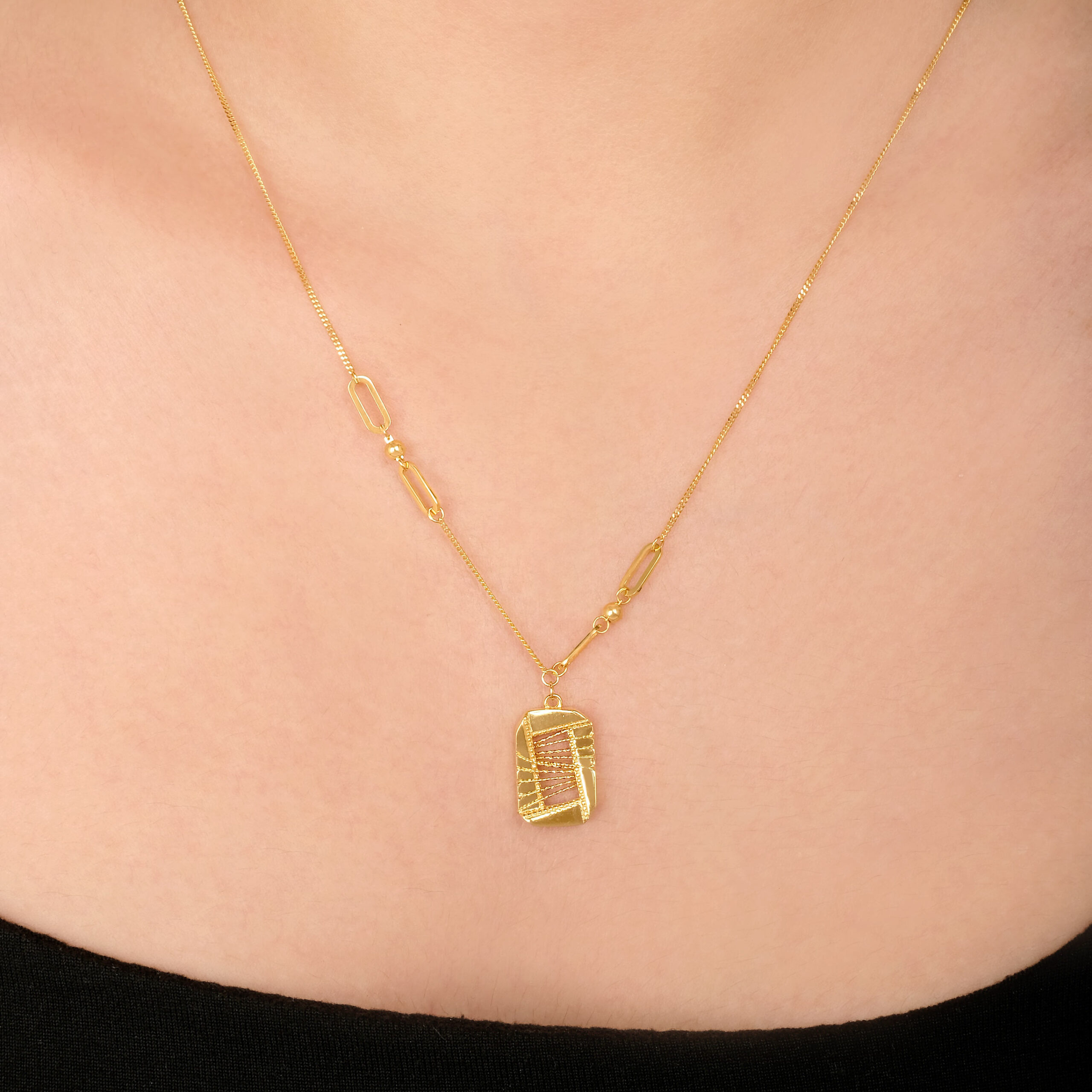 18 karat Chinese gold rectangular stud necklace with layered wire texture by Oro China Jewelry.