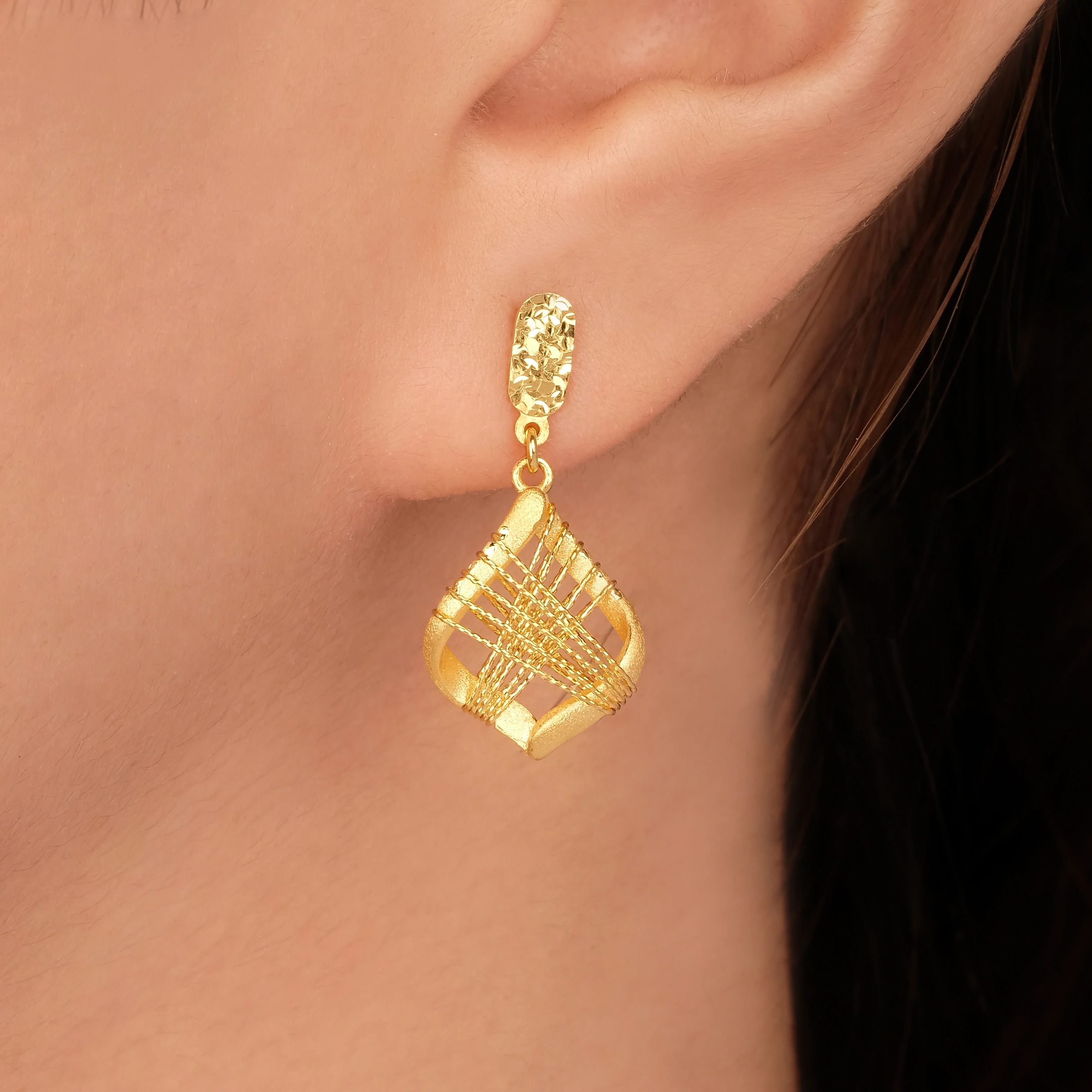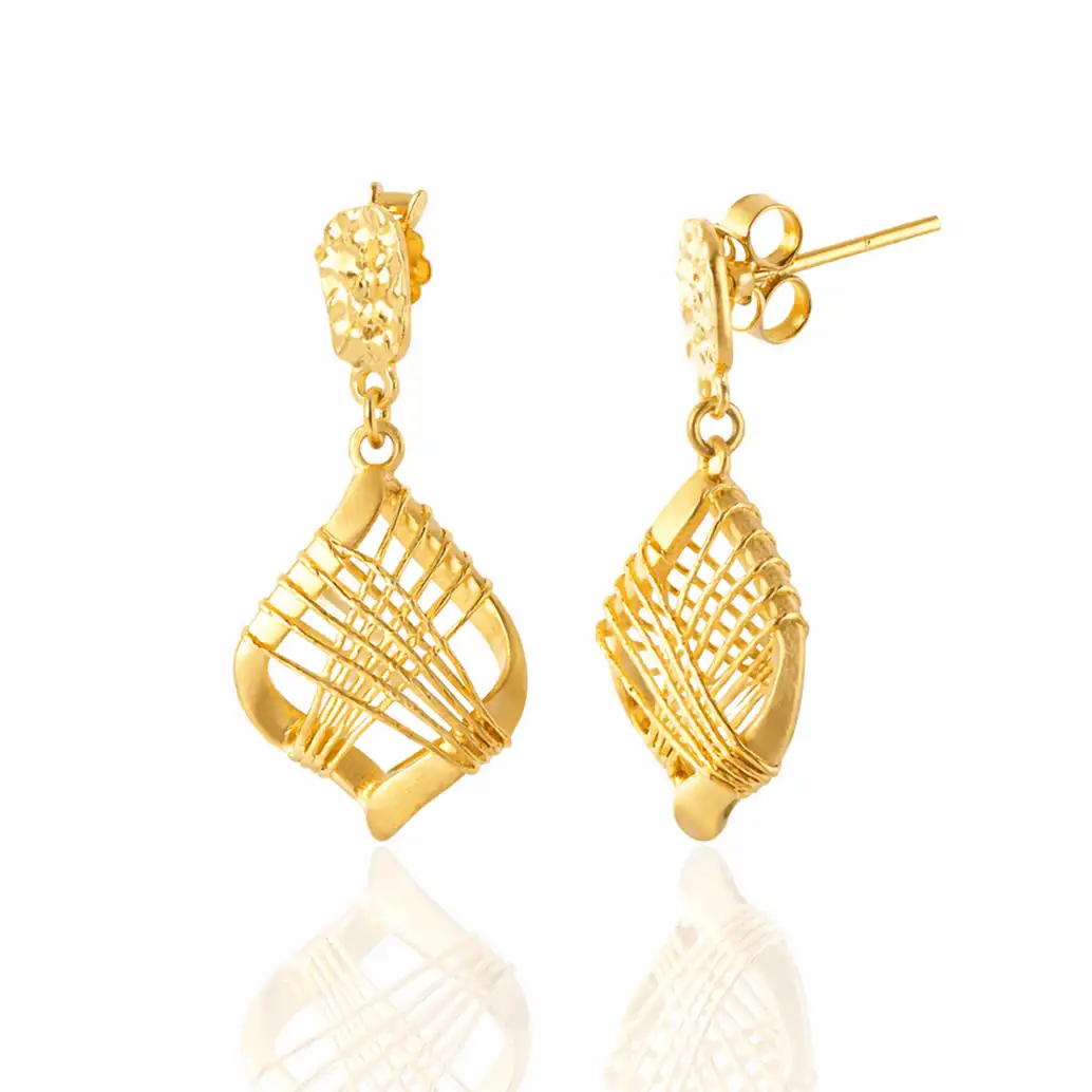 18 karat Chinese gold geometric drop earrings with layered wire detailing by Oro China Jewelry.