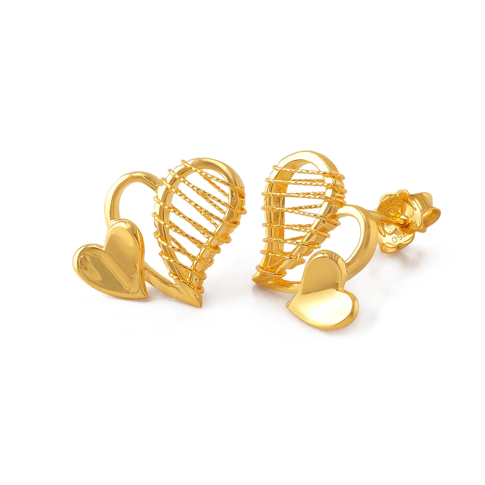 18 karat Chinese gold double-heart stud earrings featuring one solid heart and one cage-style heart by Oro China Jewelry.