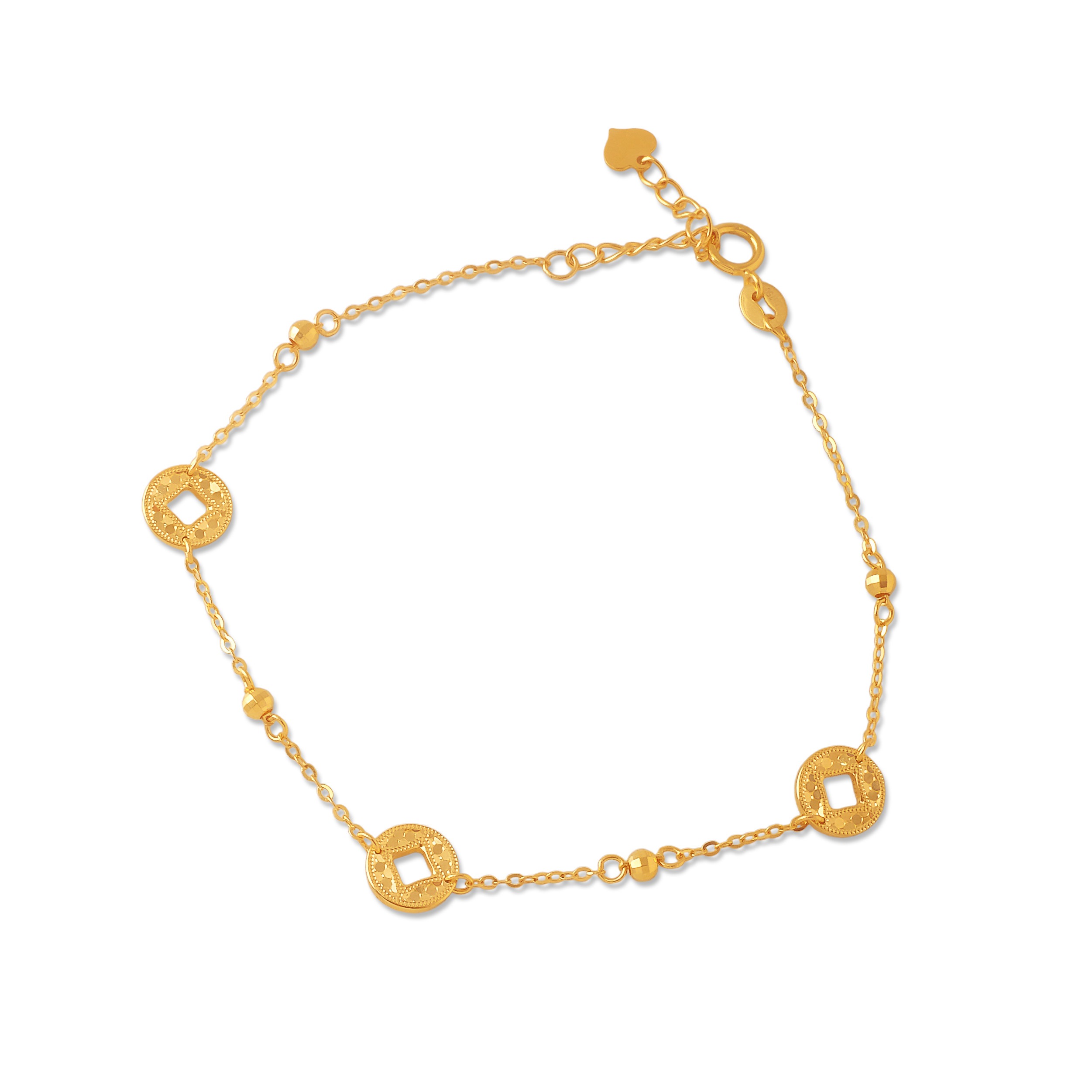 18 karat Chinese gold fine chain bracelet with spaced prosperity coin stations by Oro China Jewelry.