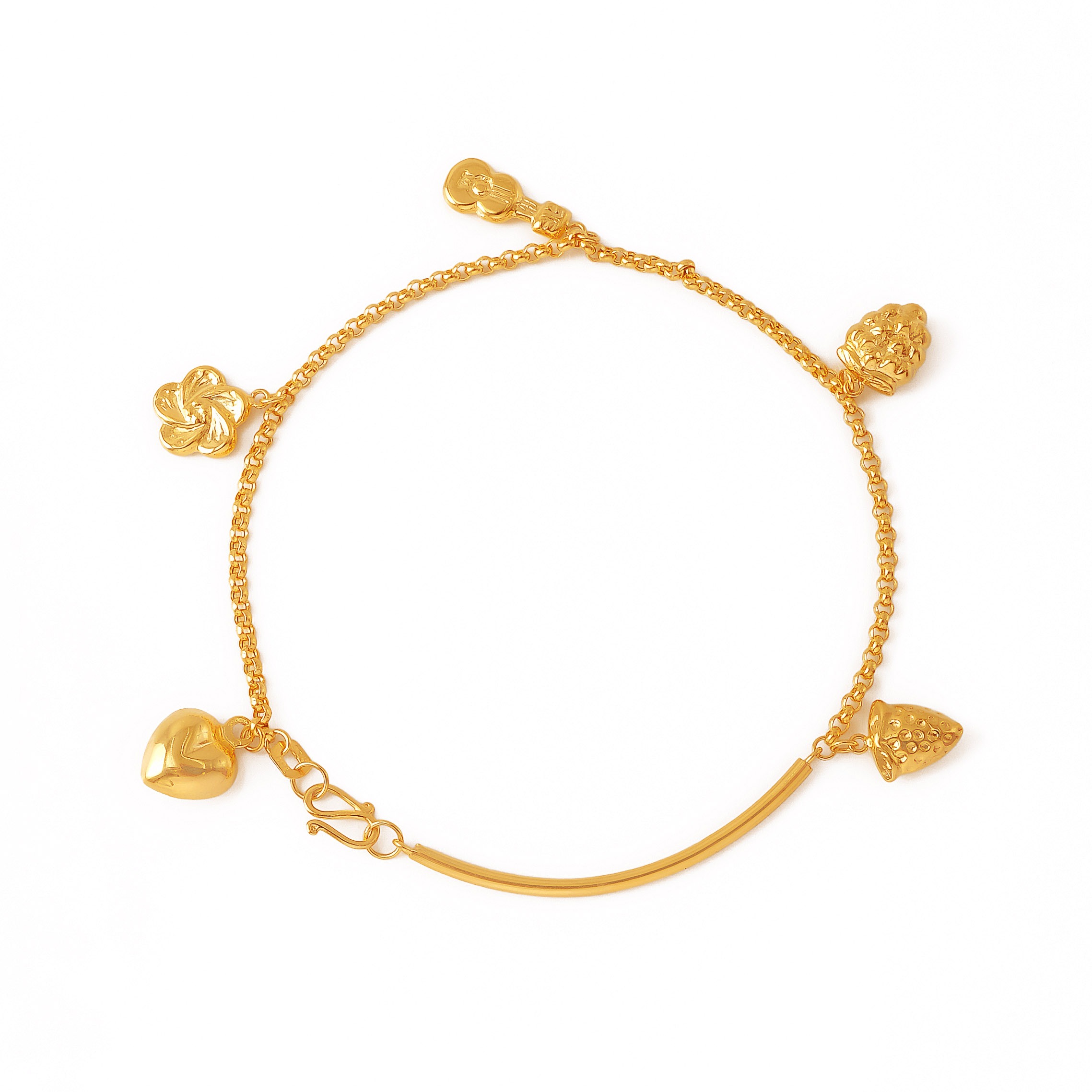 Chain bracelet with heart, flower, guitar, grapes, strawberry charms and a curved bar