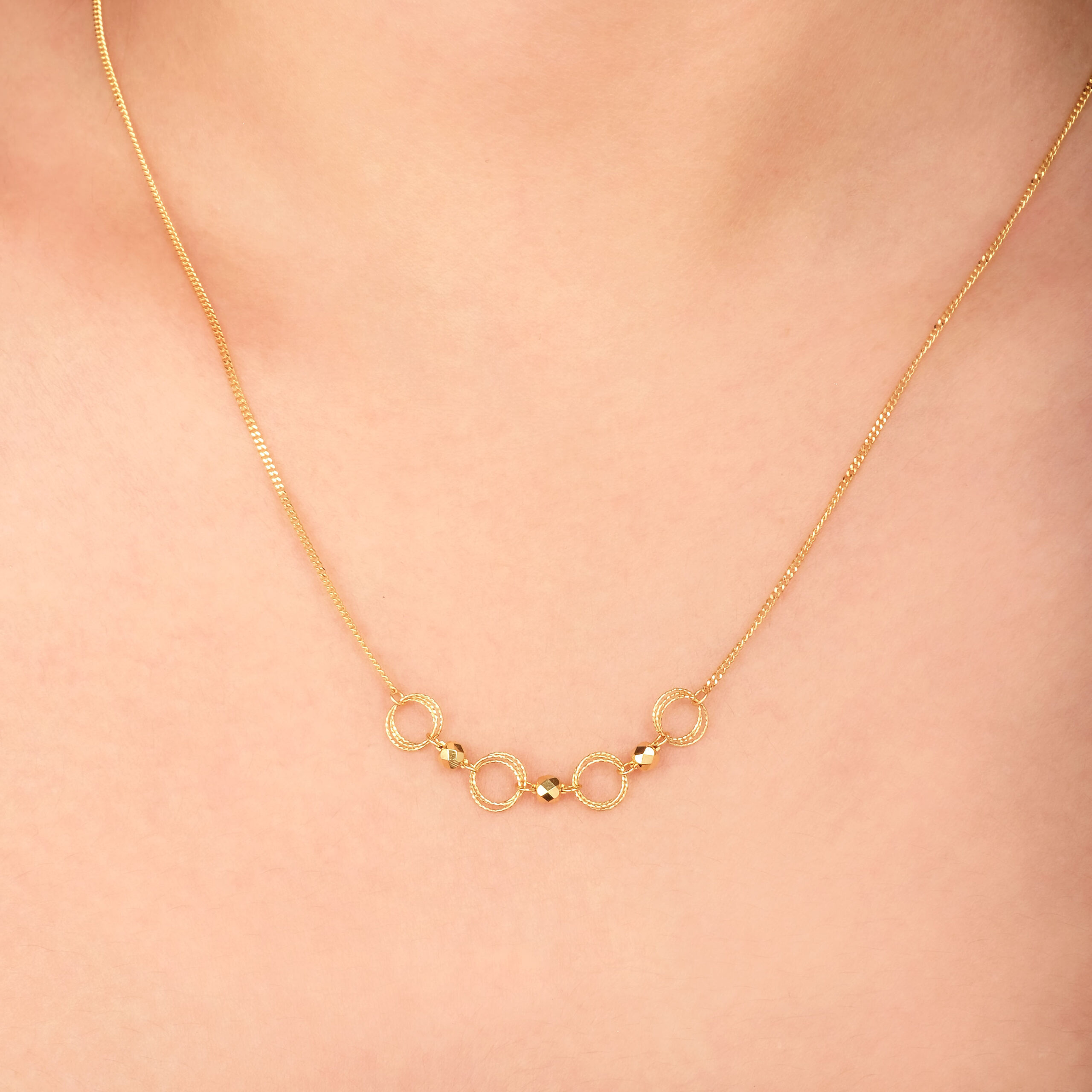18 karat Chinese gold necklace designed with interlocking textured circular rings and faceted bead accents by Oro China Jewelry.