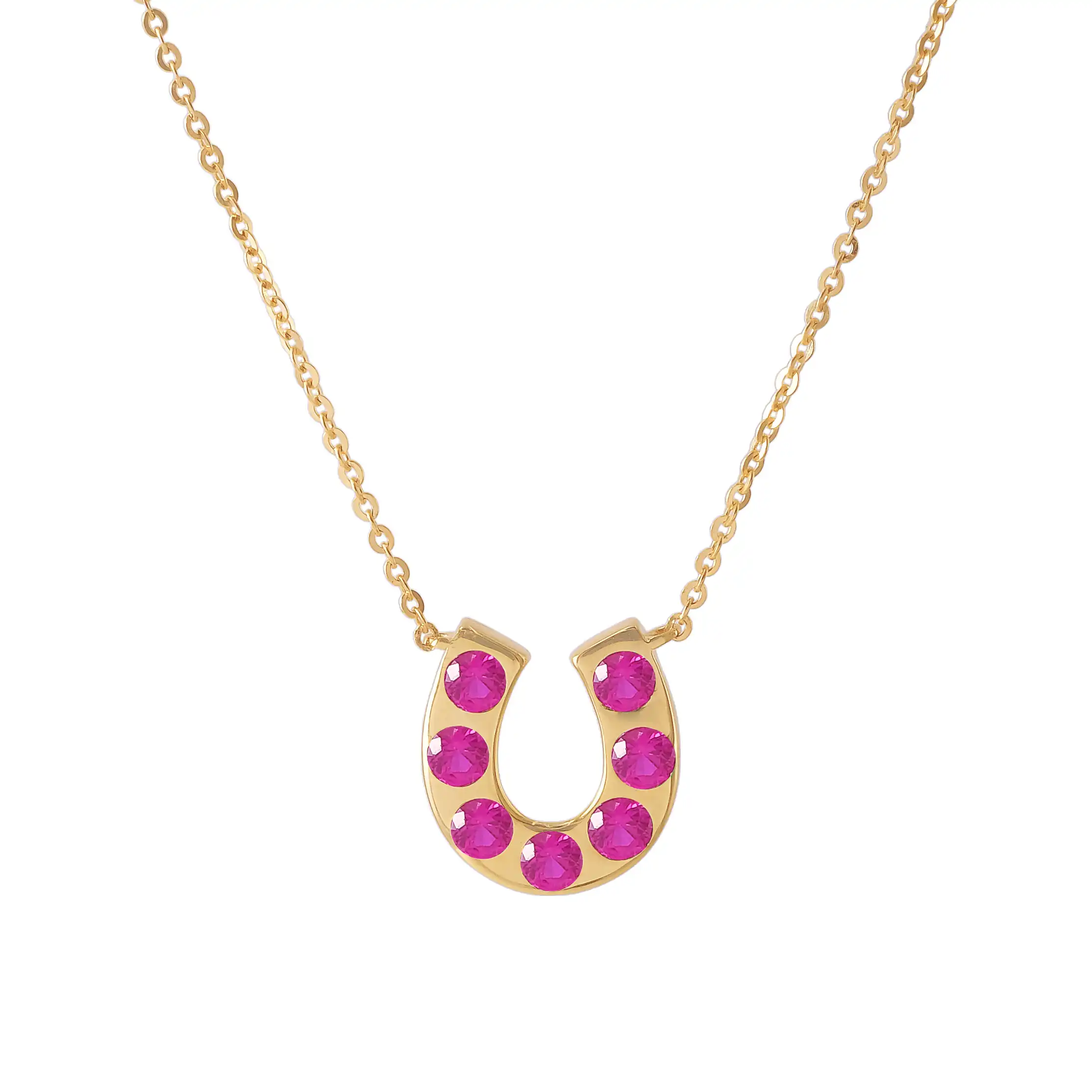 14 karat Italian gold necklace featuring a horseshoe design set with ruby by Oro China Jewelry.