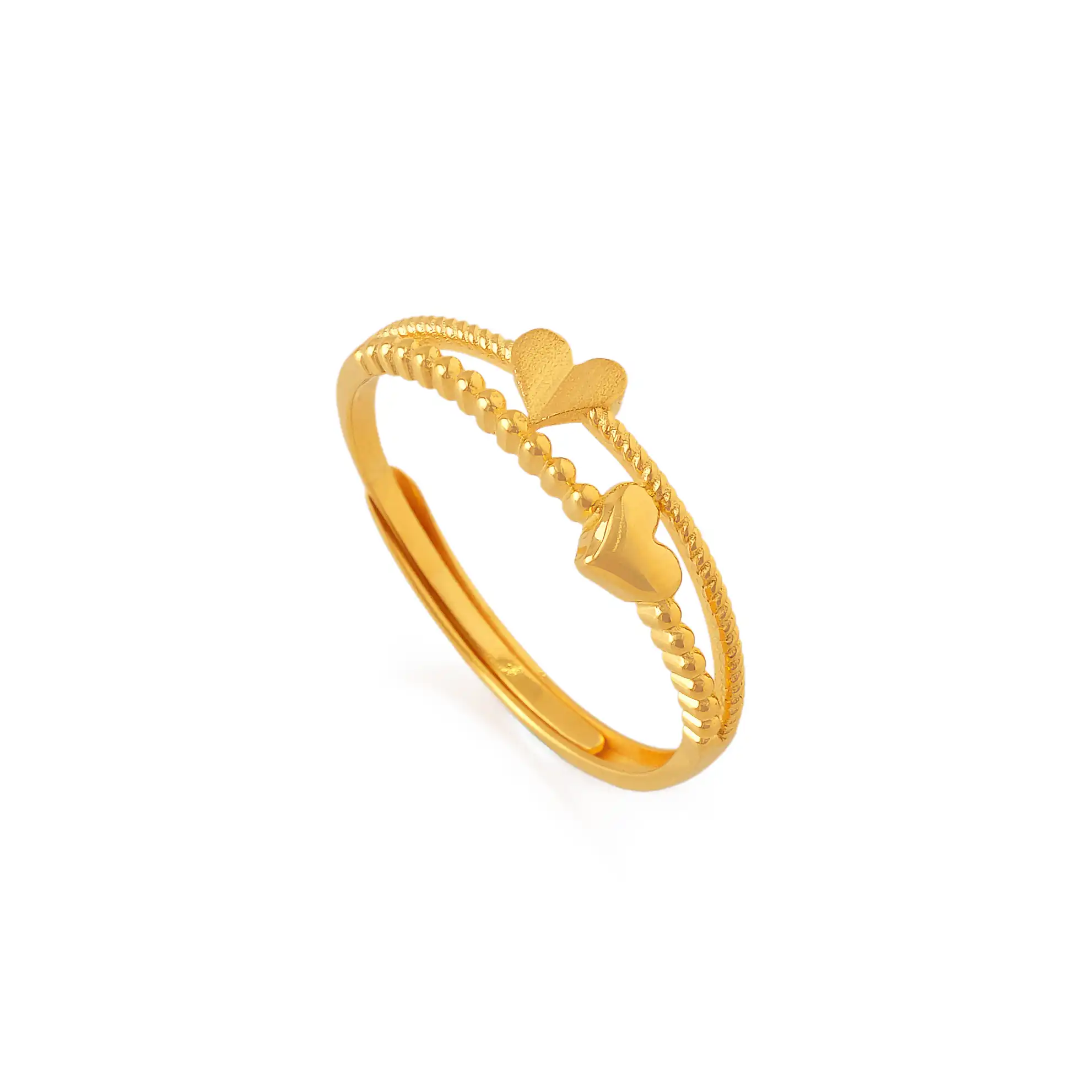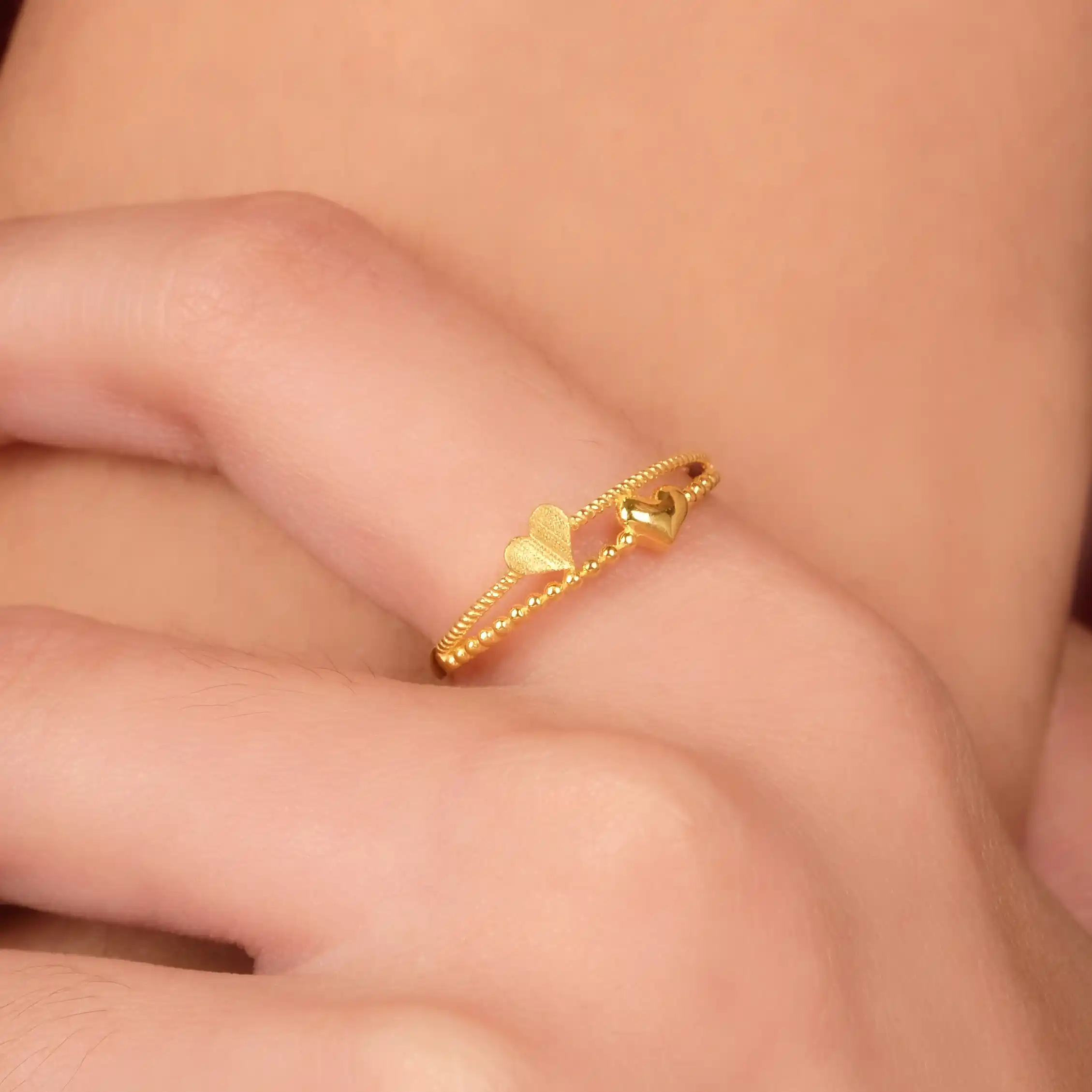18 karat Chinese gold ring featuring two hearts, one satin and one polished, on a stacked-style beaded and twisted band by Oro China Jewelry.
