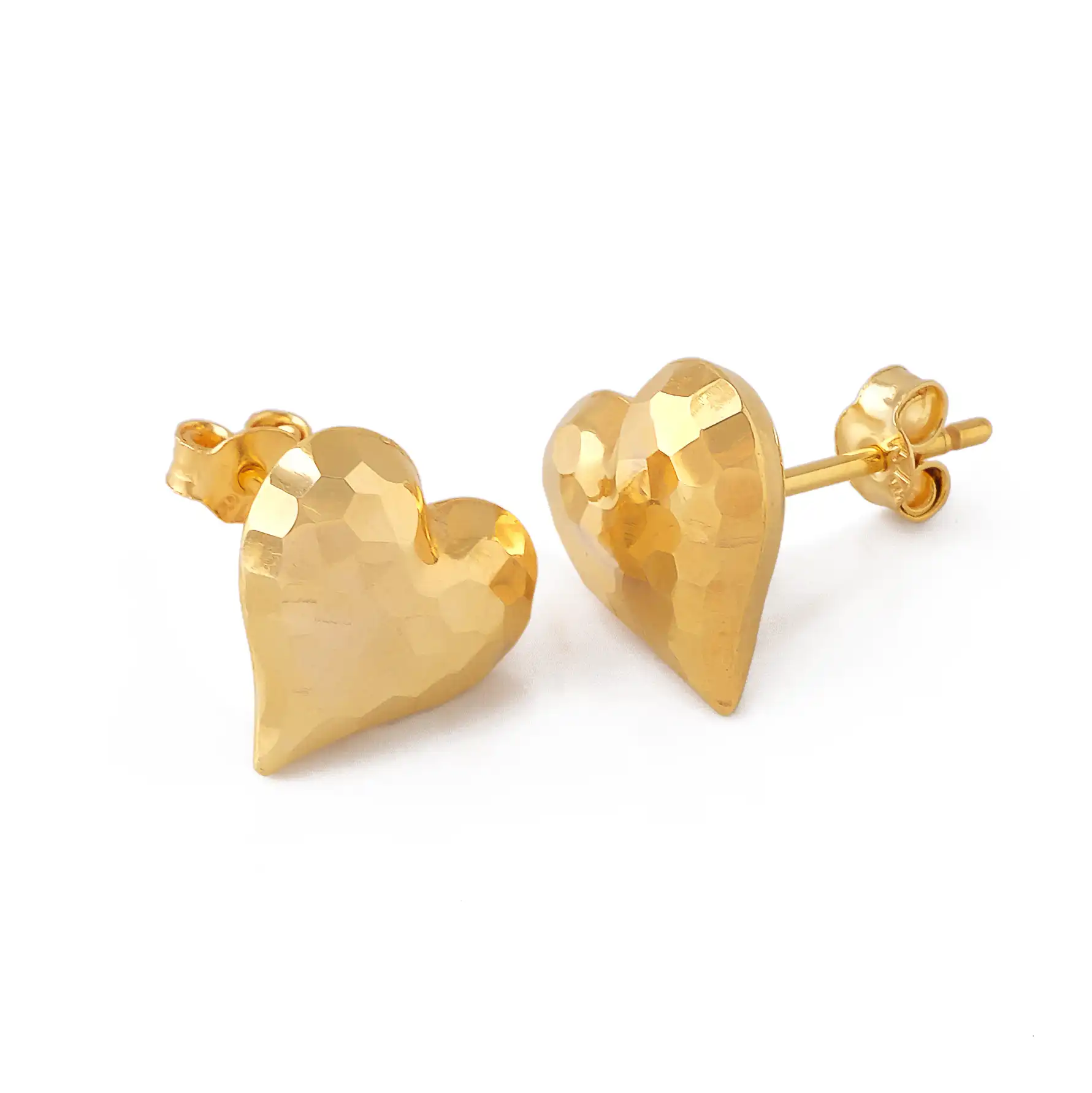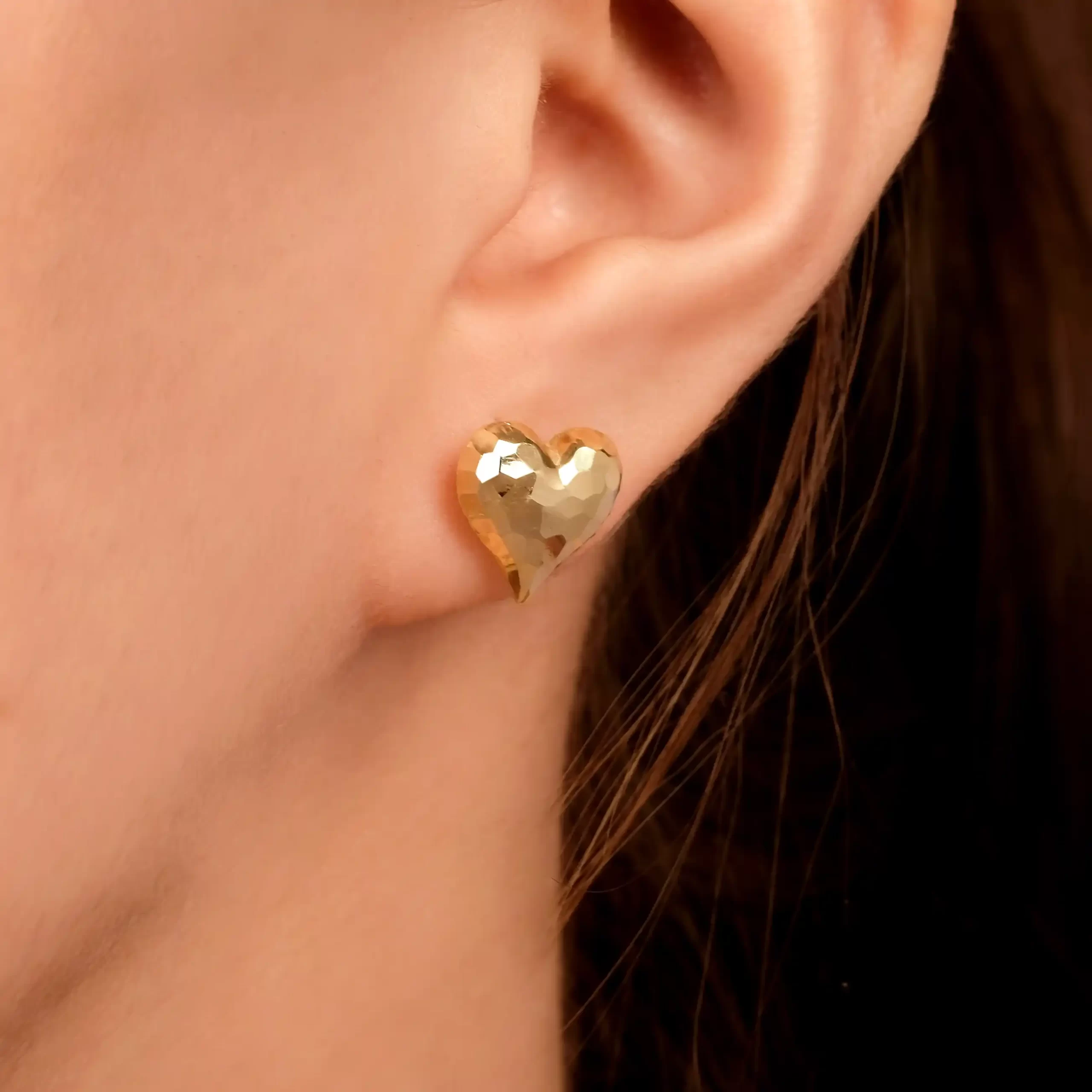18 karat Italian gold heart stud earrings with faceted finish by Oro China Jewelry.