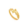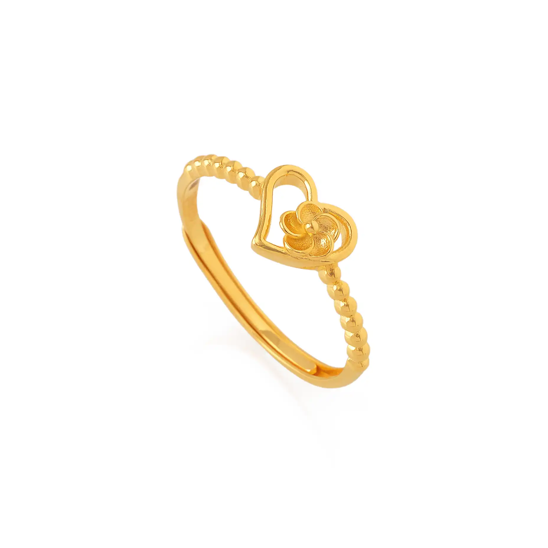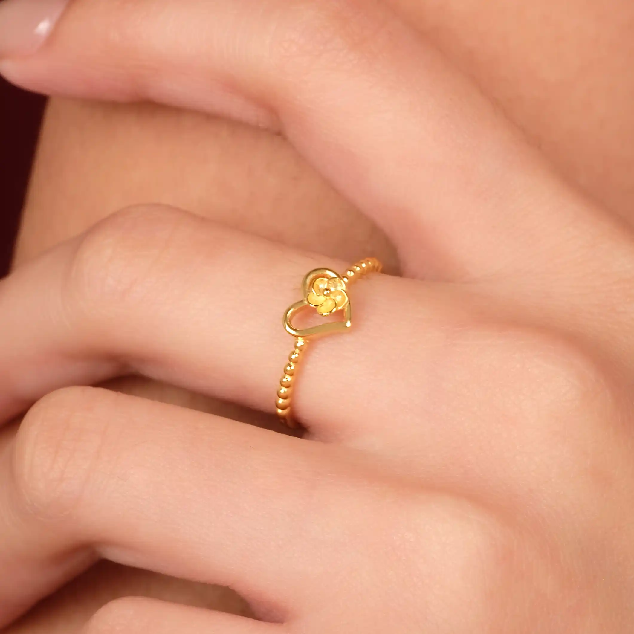 18 karat Chinese gold ring with an open heart frame and a delicate center flower on a beaded band by Oro China Jewelry.