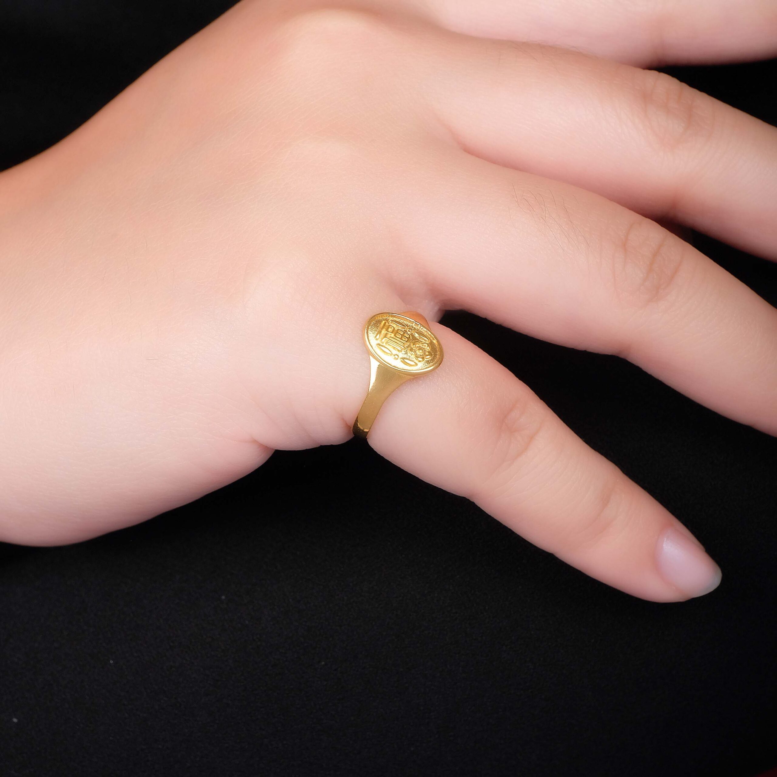 Oval ring with a floral detail and symbol for joy and blessings.