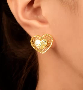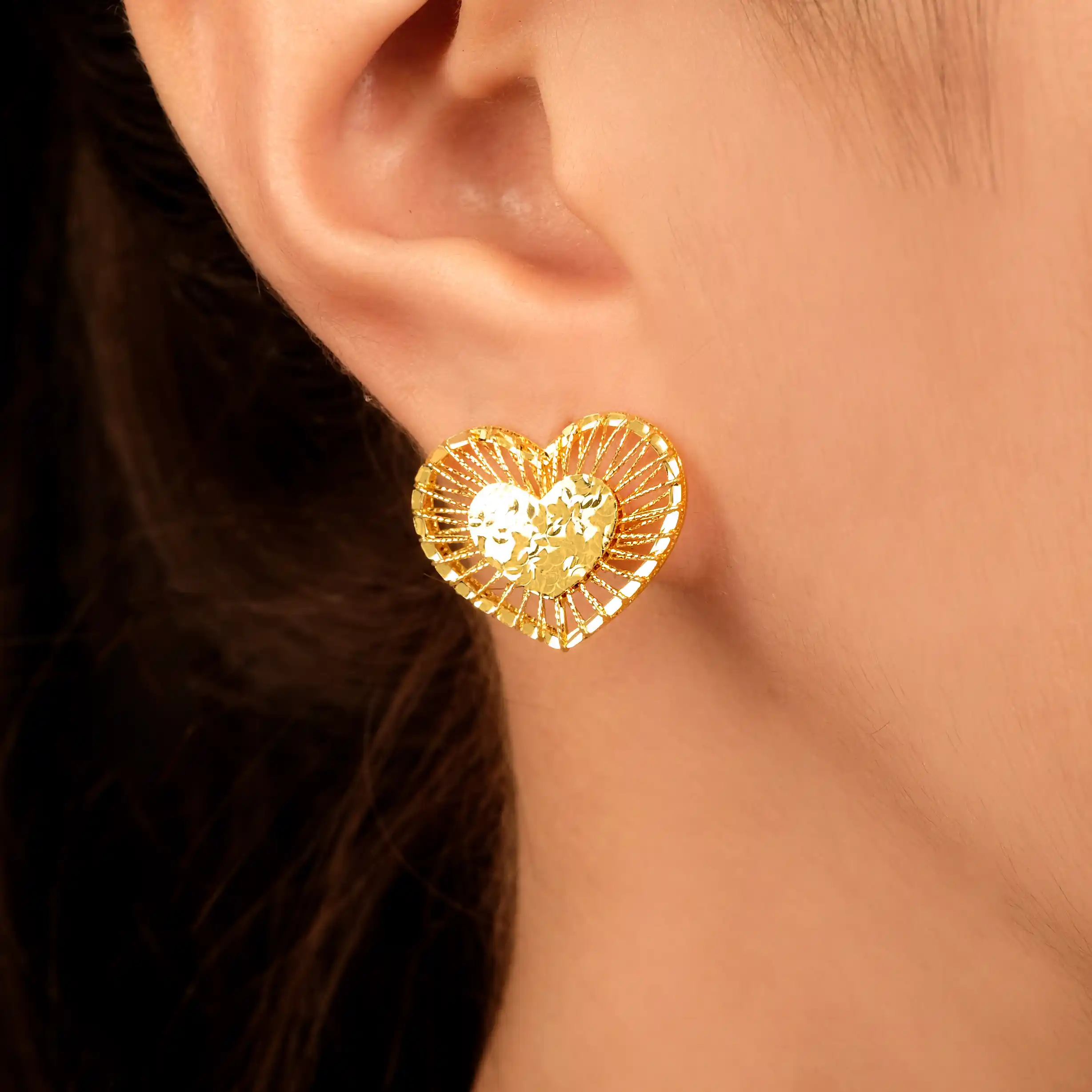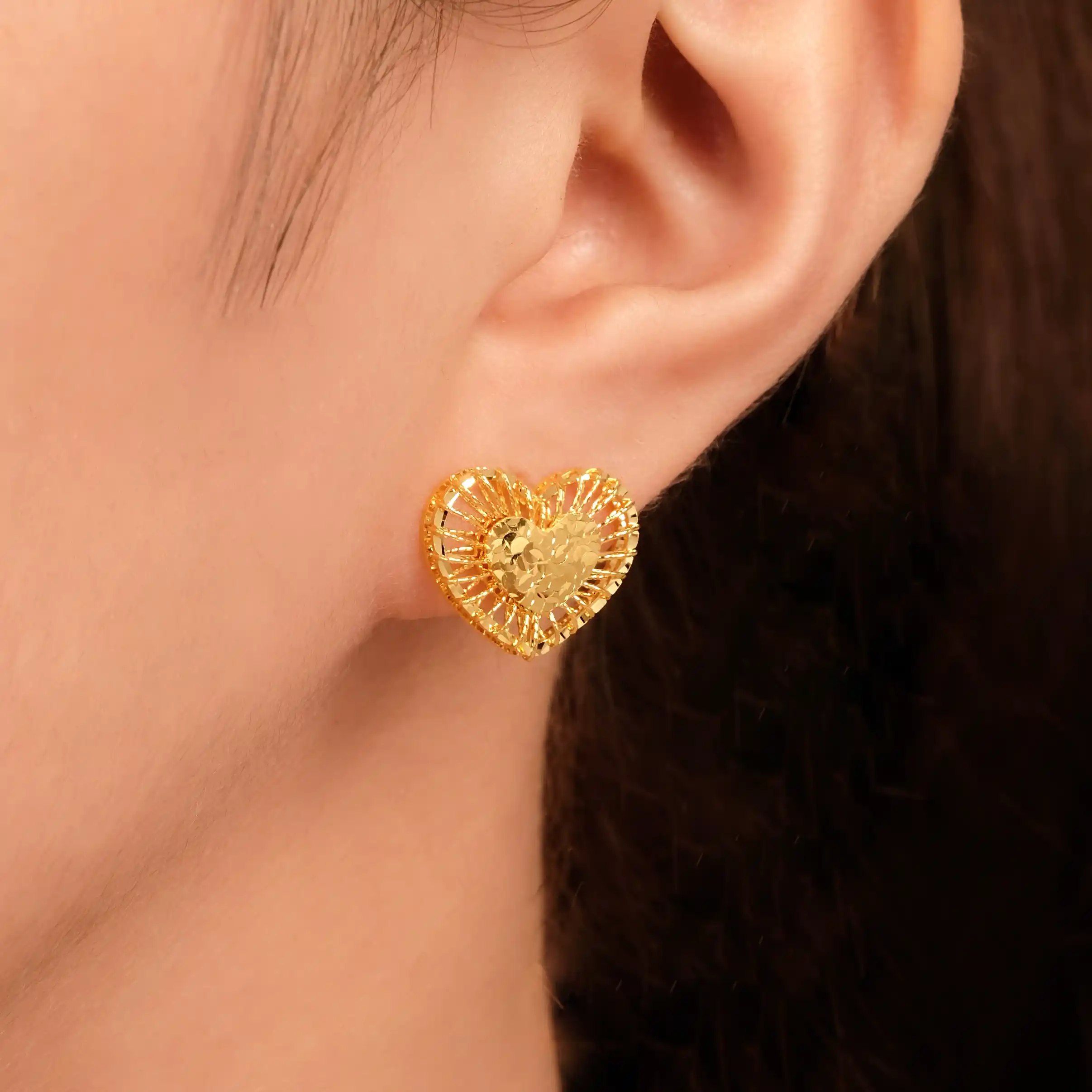18 karat Chinese gold heart stud earrings featuring a filigree border and sun-cut center by Oro China Jewelry.