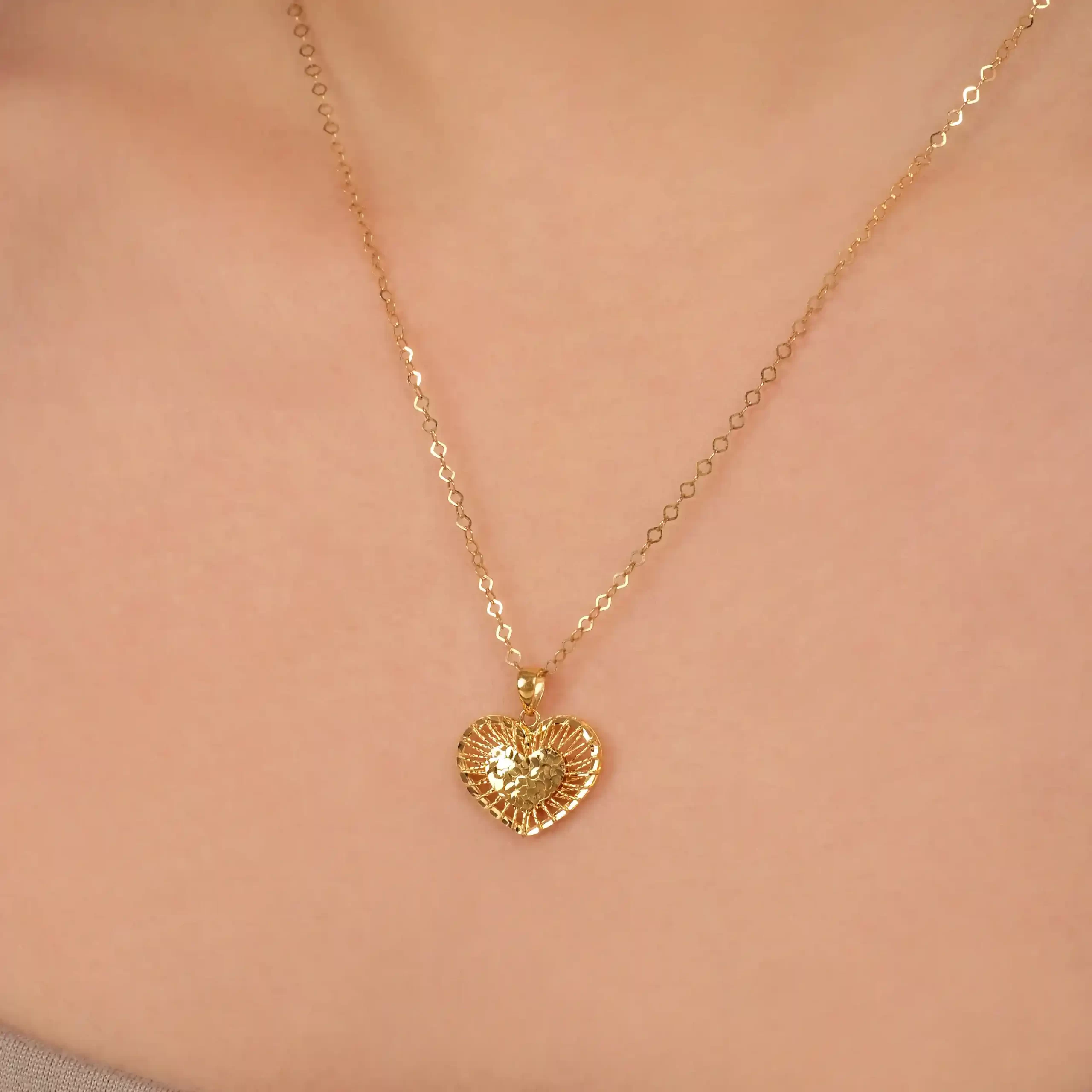 18 karat Chinese gold large heart pendant featuring a filigree border and sun-cut center by Oro China Jewelry.
