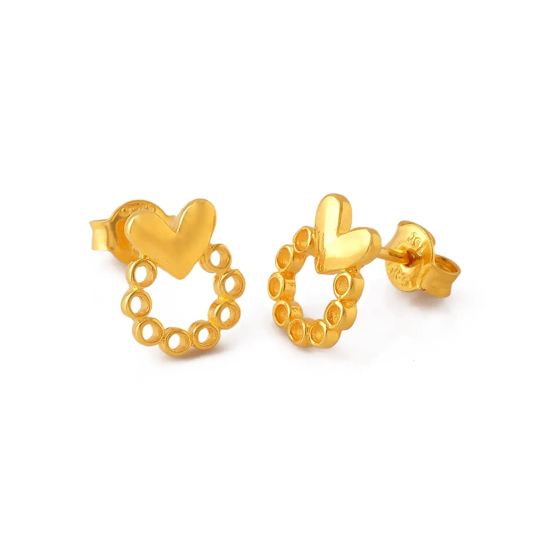 18 karat Chinese gold stud earrings featuring a smooth heart atop a beaded circle by Oro China Jewelry.