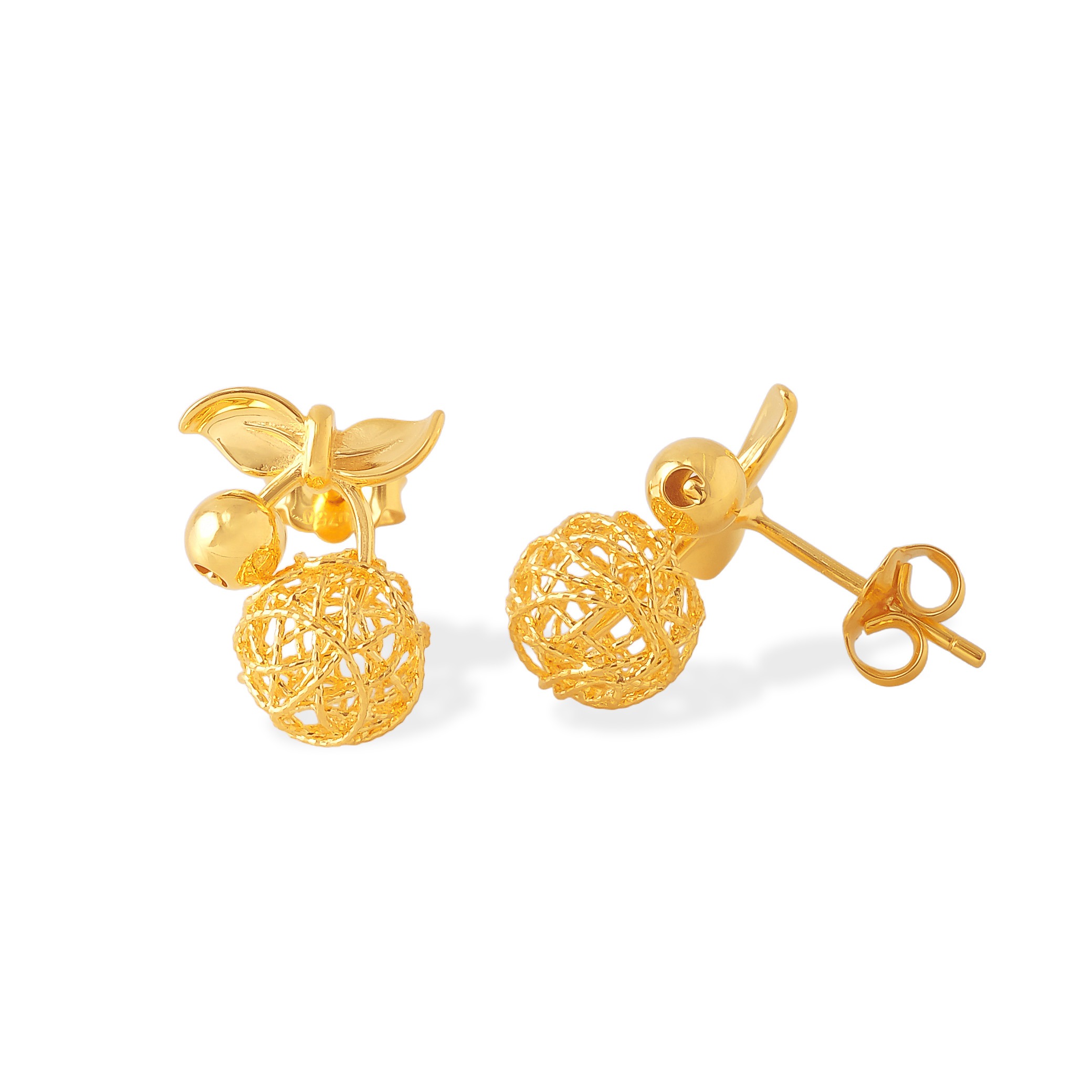 18 karat Chinese gold square hoop stud earrings with woven orb detail by Oro China Jewelry.