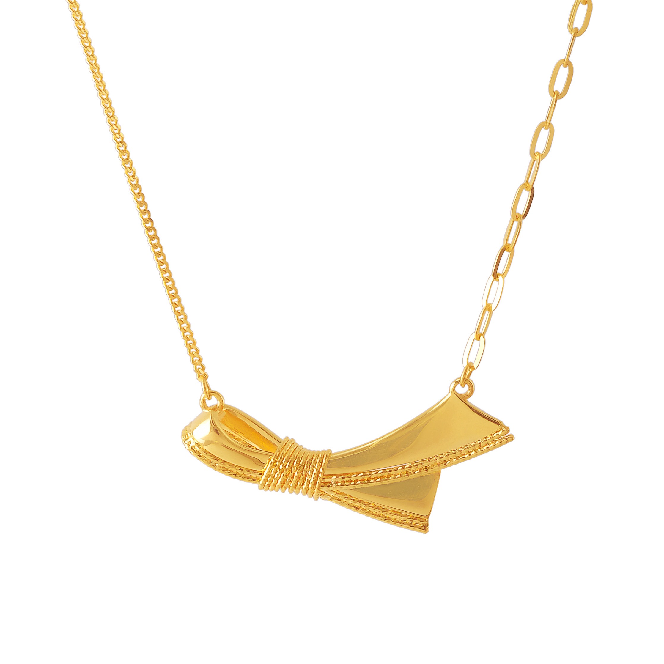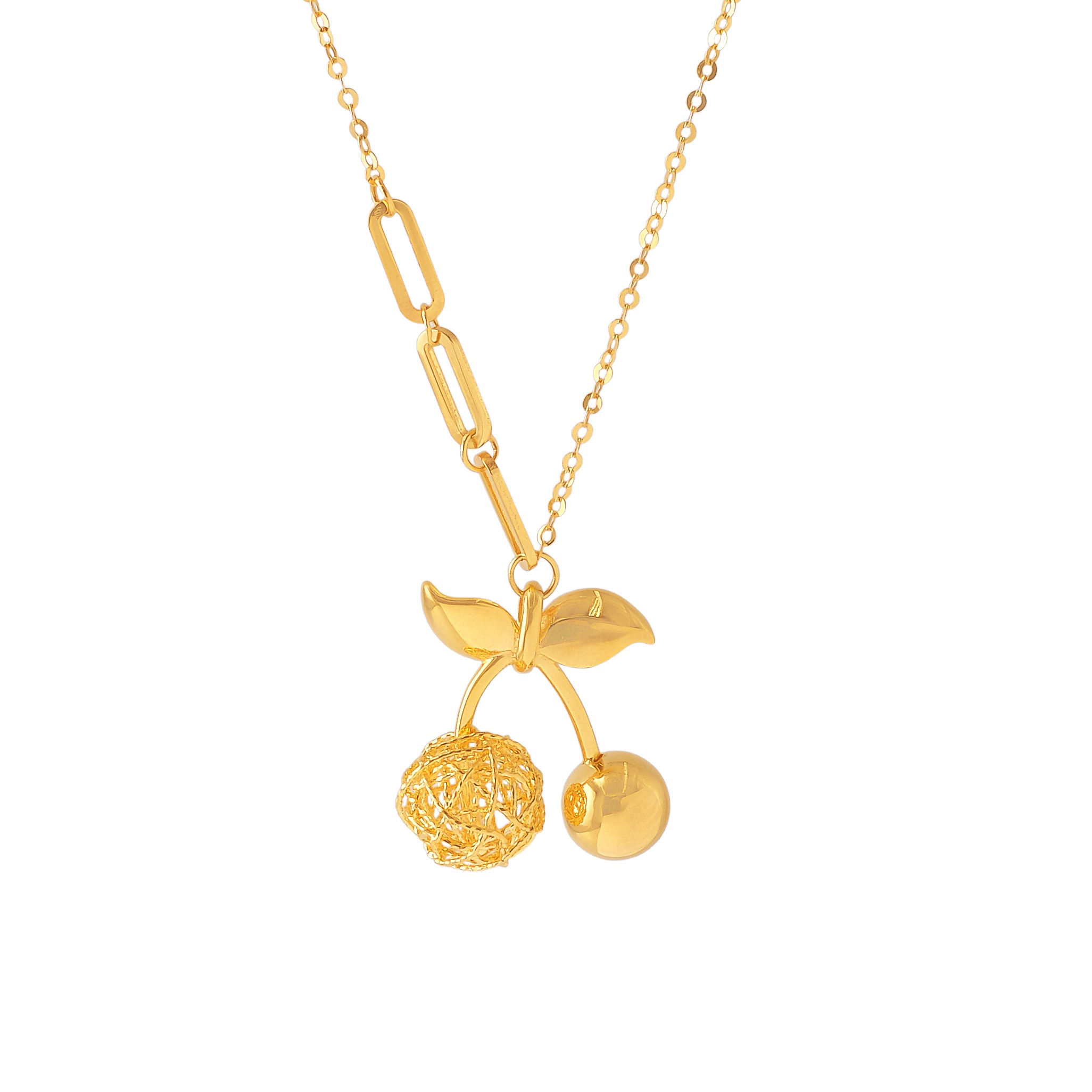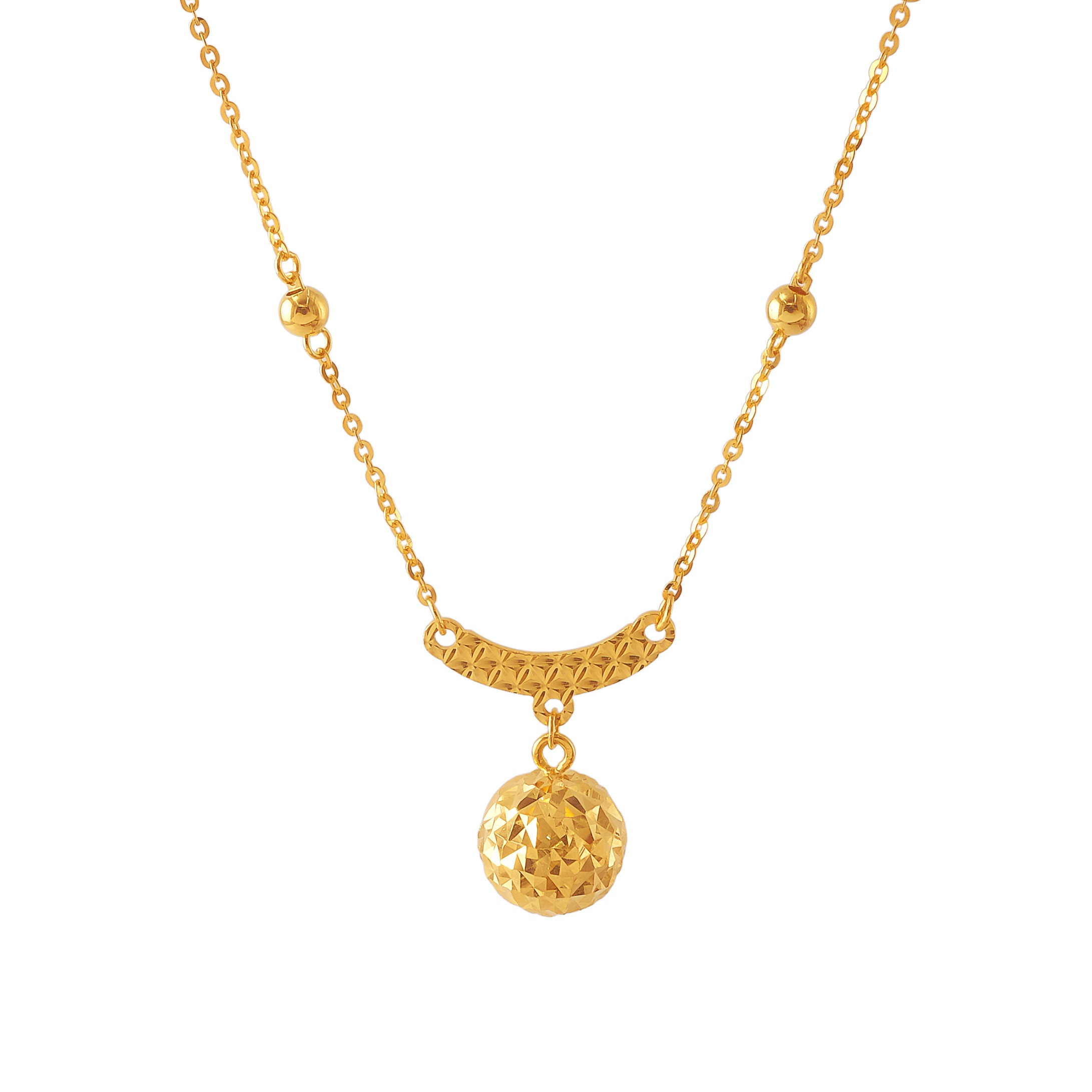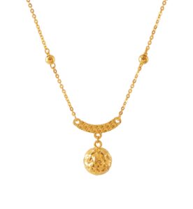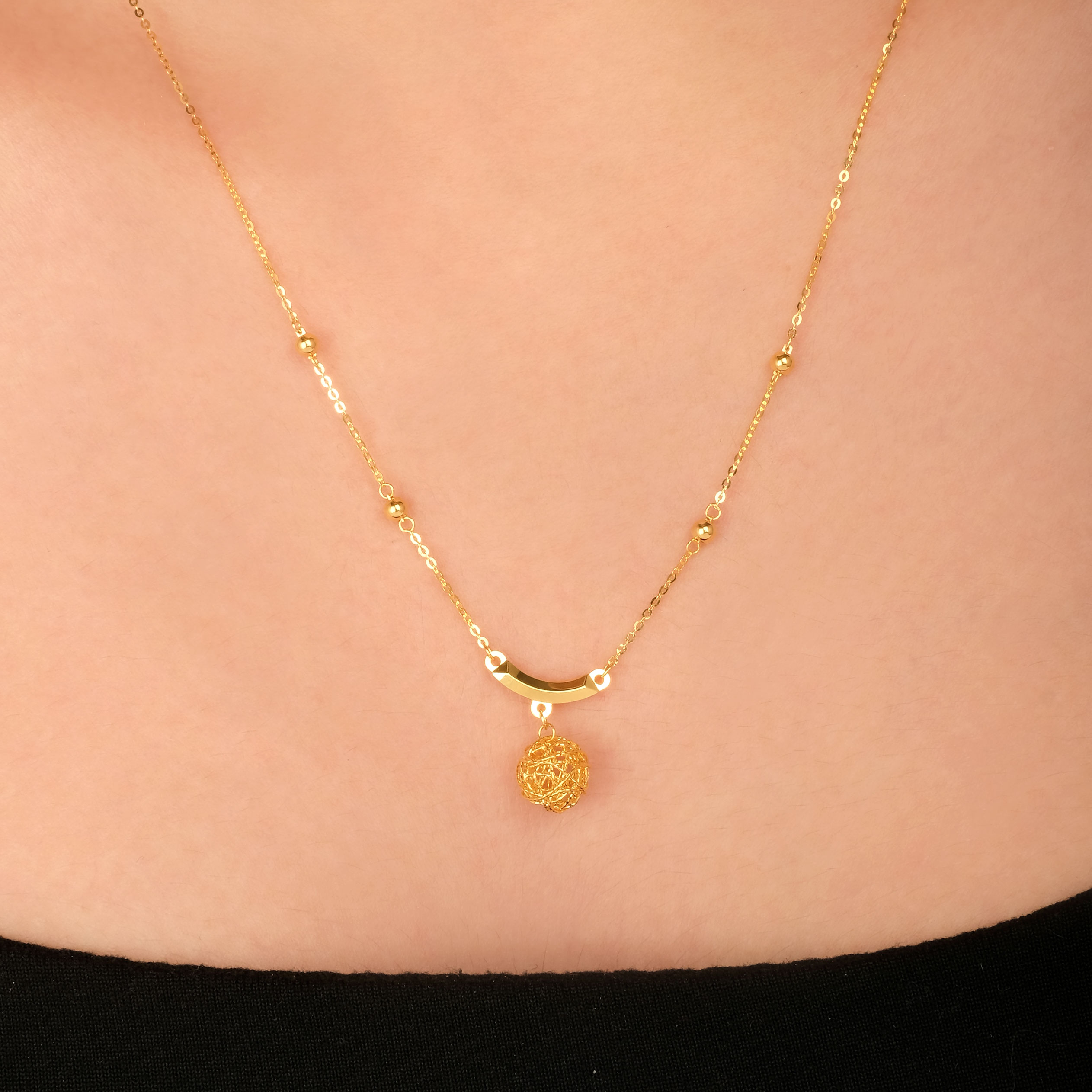 18 karat Chinese gold necklace with a curved bar and dangling woven orb by Oro China Jewelry.