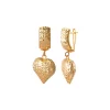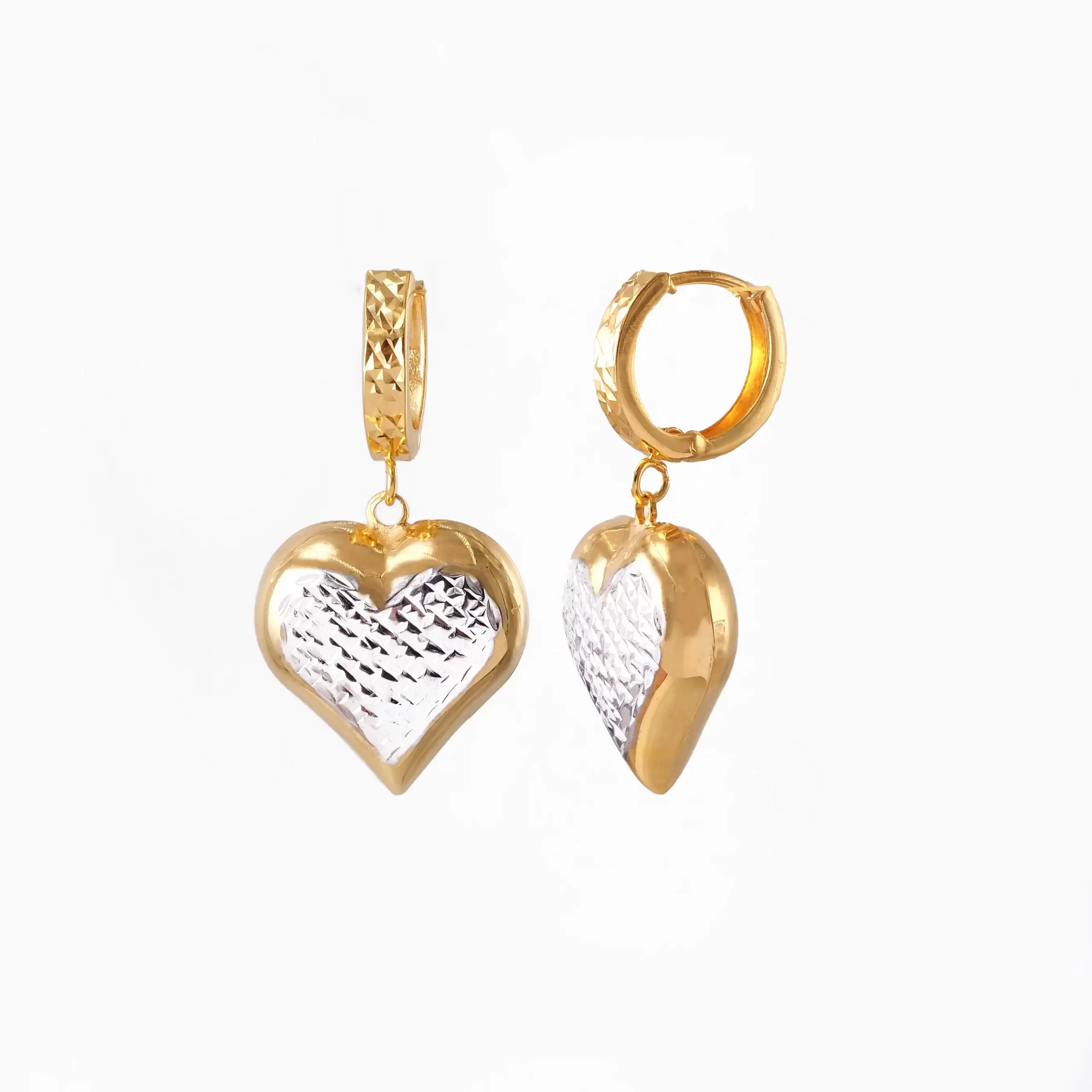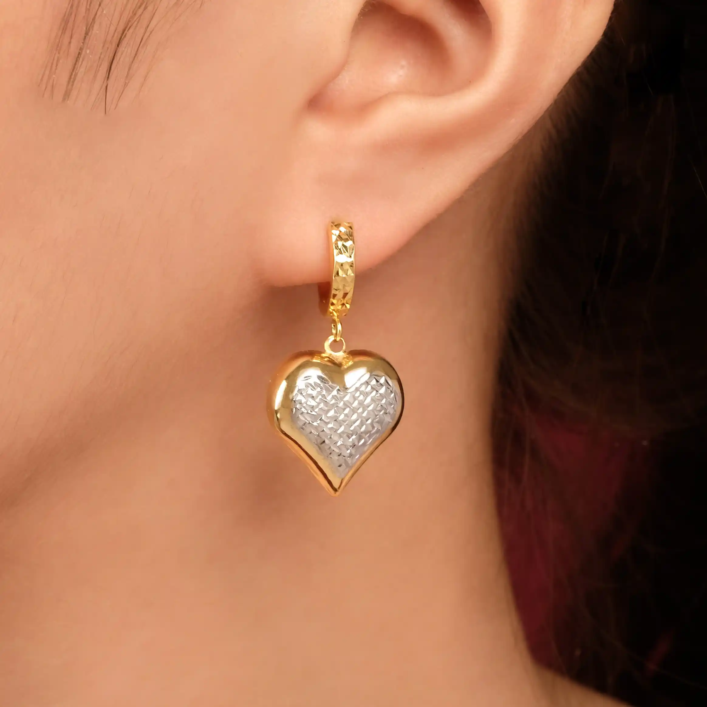 18 karat Italian gold drop earrings with textured hoop and faceted heart charm by Oro China Jewelry.