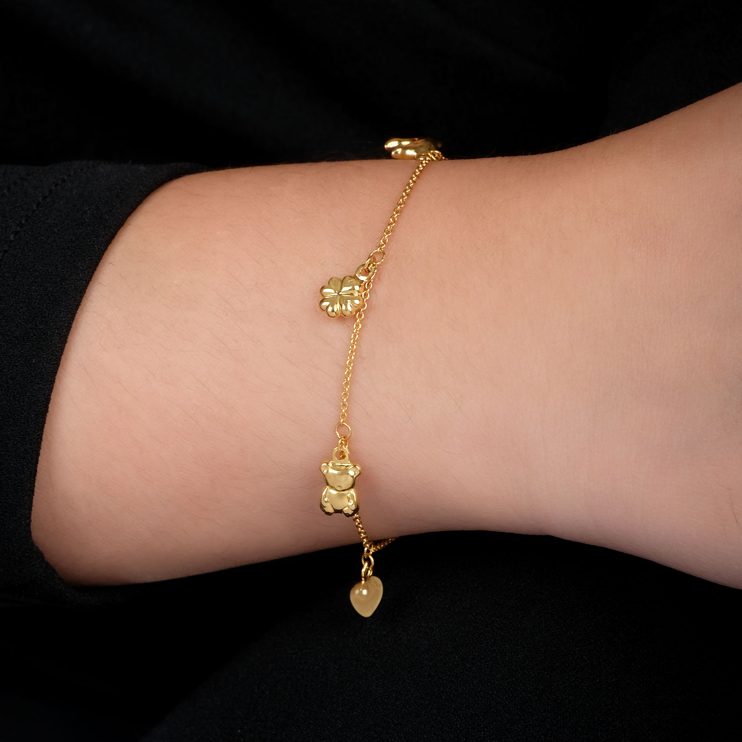 Chain bracelet with ball, dolphin, clover, bear, and heart charms
