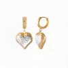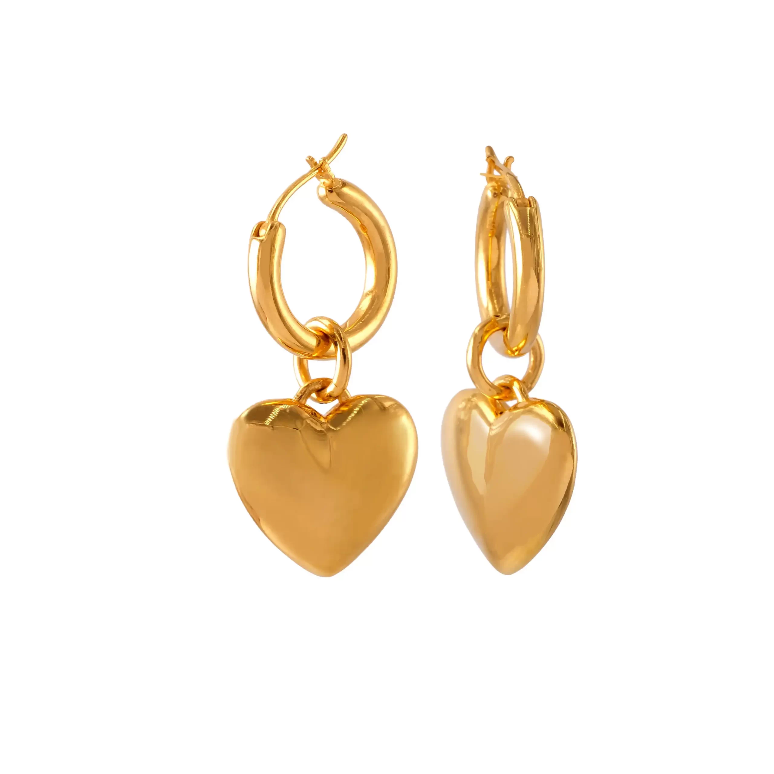 18 karat Chinese gold hoop earrings featuring a polished puff heart dangle by Oro China Jewelry.