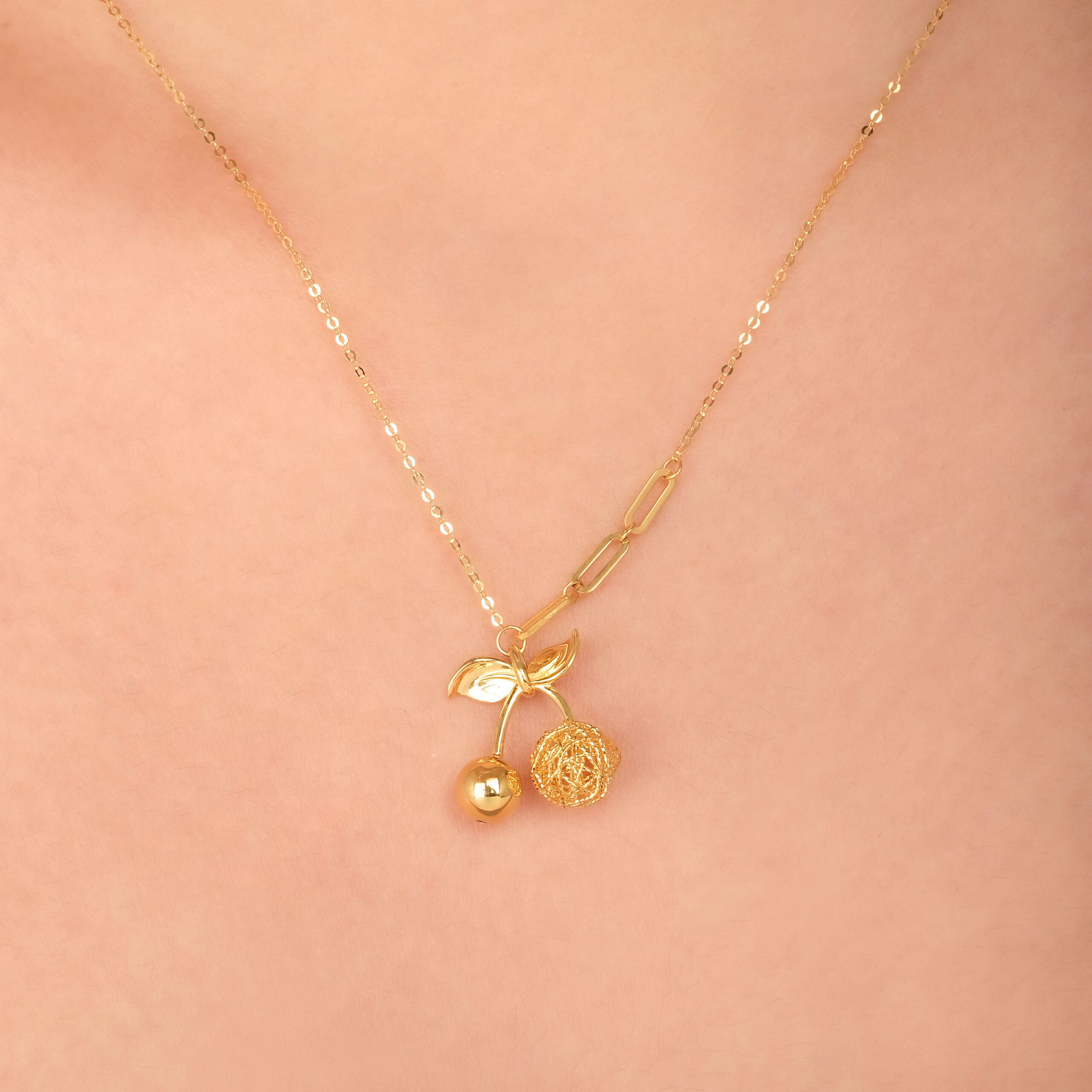 18 karat Chinese gold cherry necklace with polished and woven orb details by Oro China Jewelry.