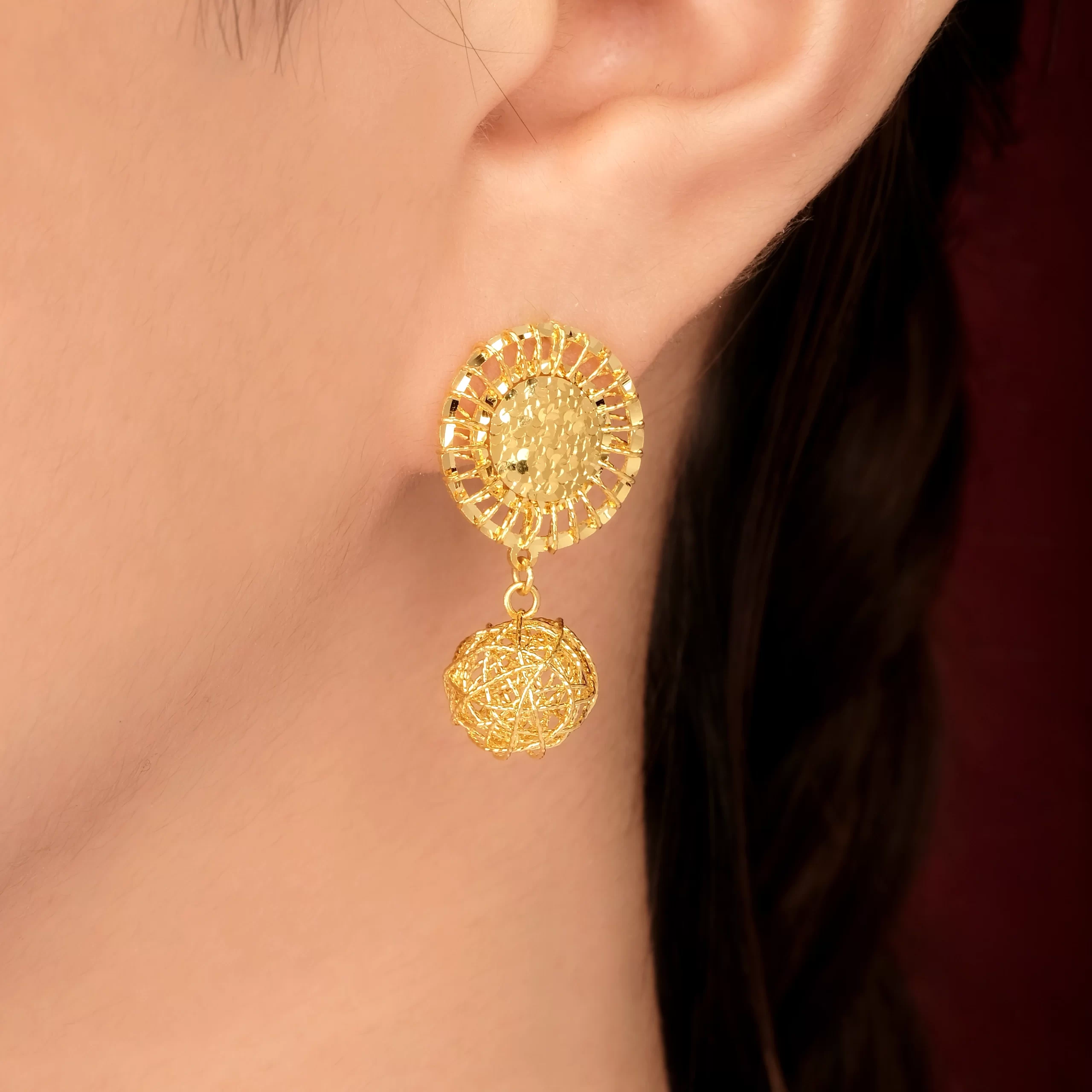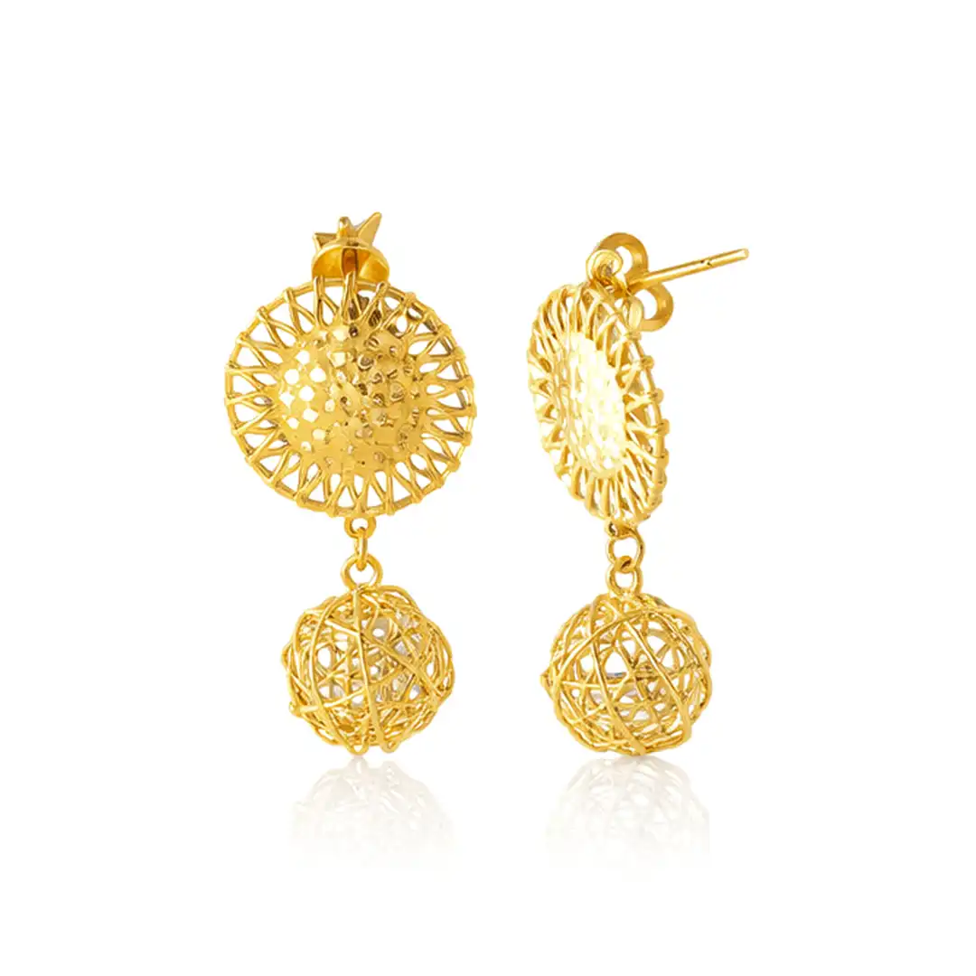 18 karat Chinese gold circular drop earrings with textured disc and woven orb by Oro China Jewelry.