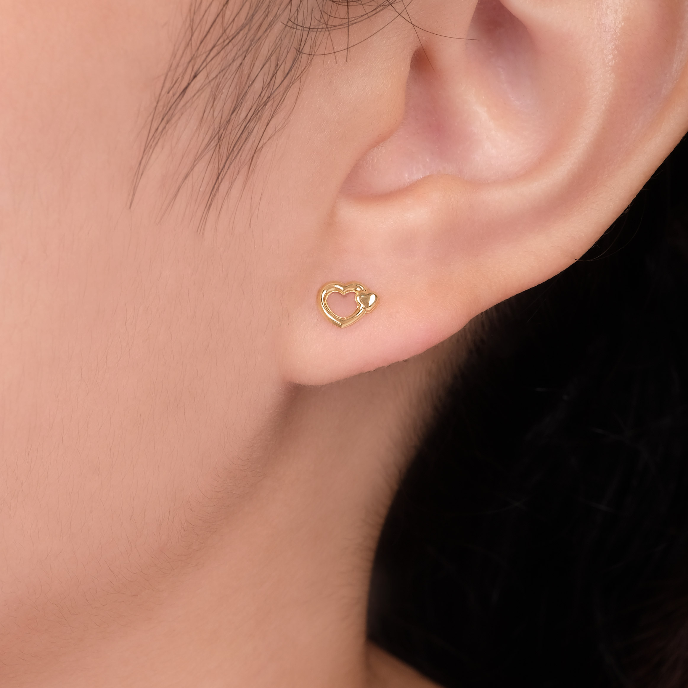 Open heart stud earrings with tiny heart accent