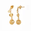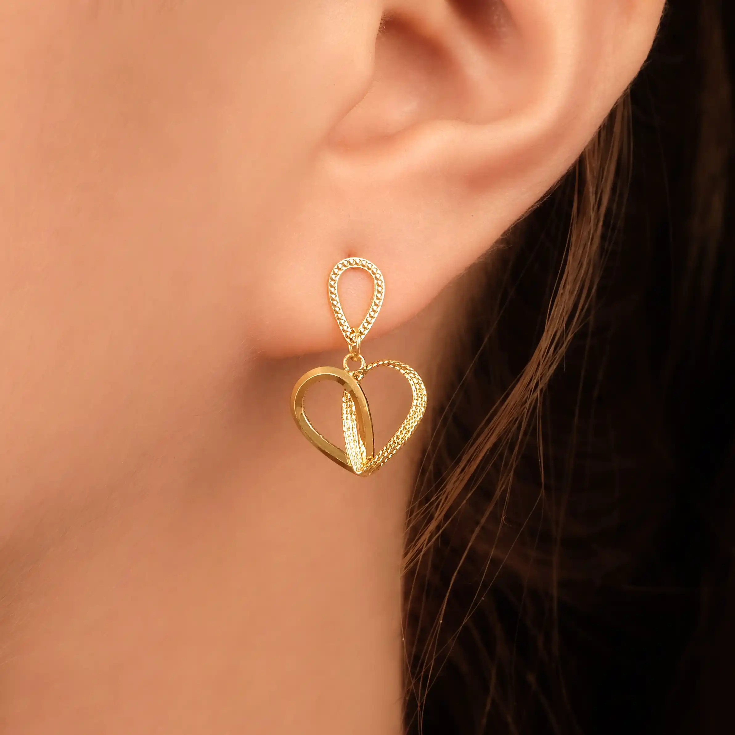 18 karat Chinese gold earrings with a teardrop post and a dangling open heart frame by Oro China Jewelry.