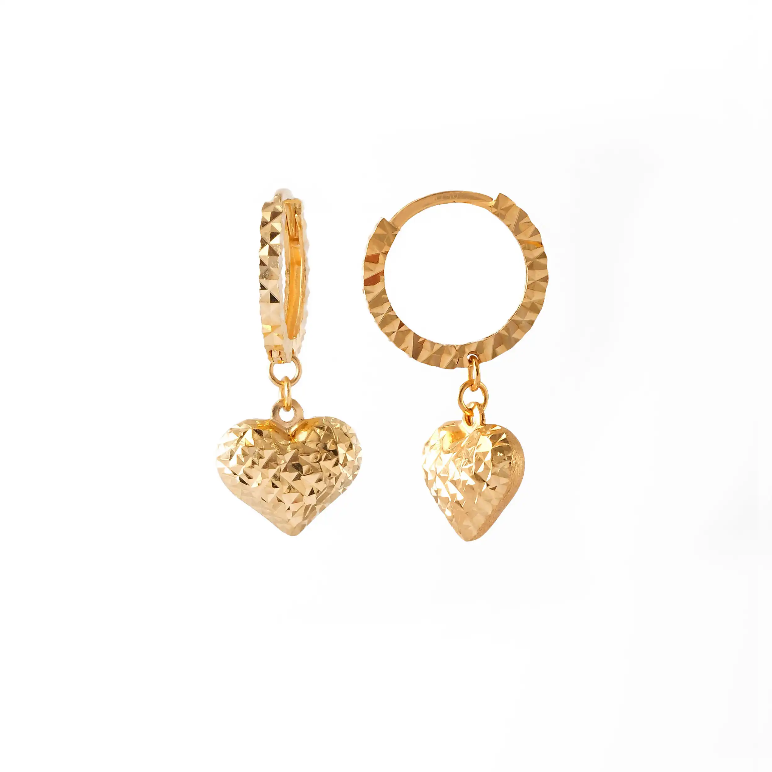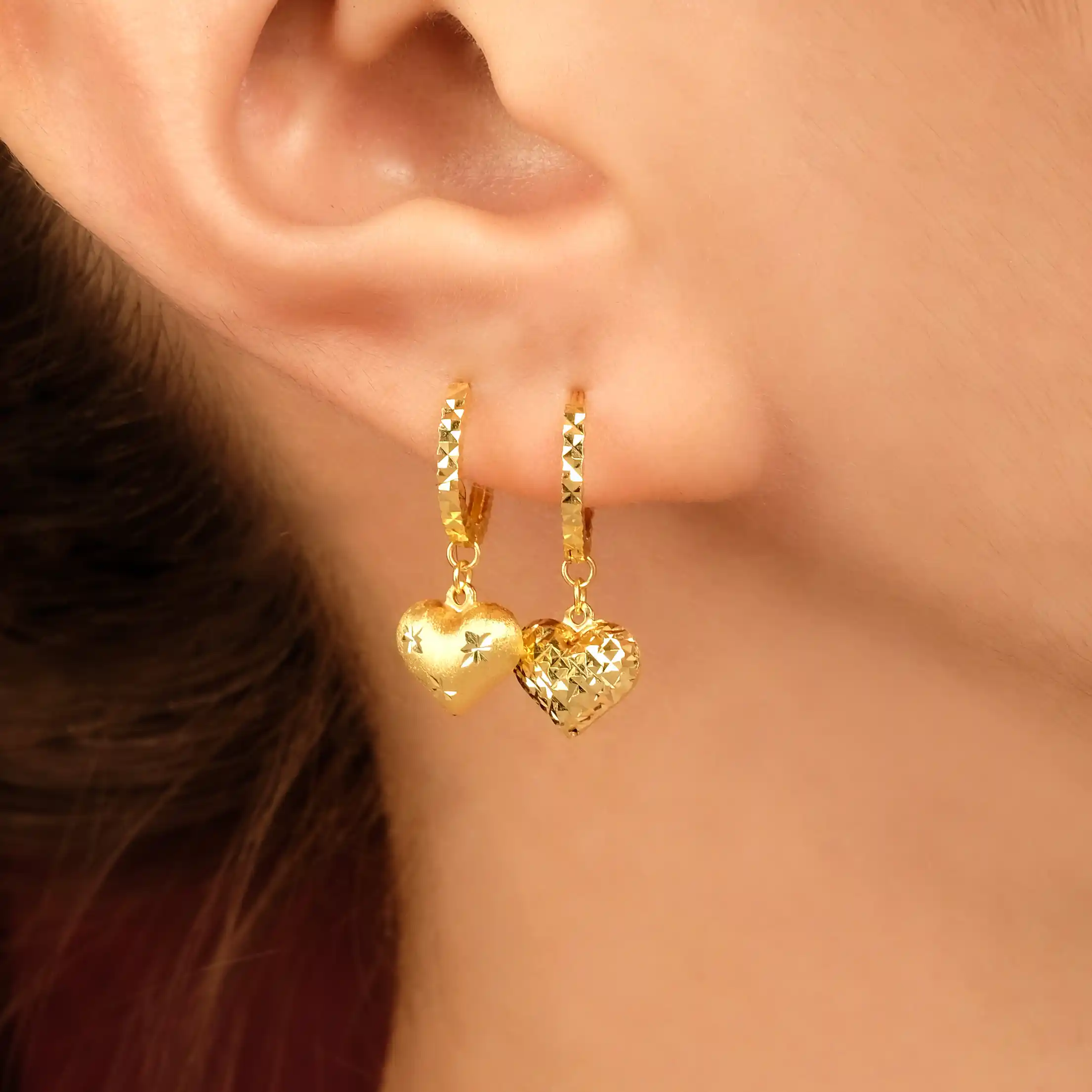 18 karat Chinese gold hoop earrings with a reversible textured puff heart dangle by Oro China Jewelry.