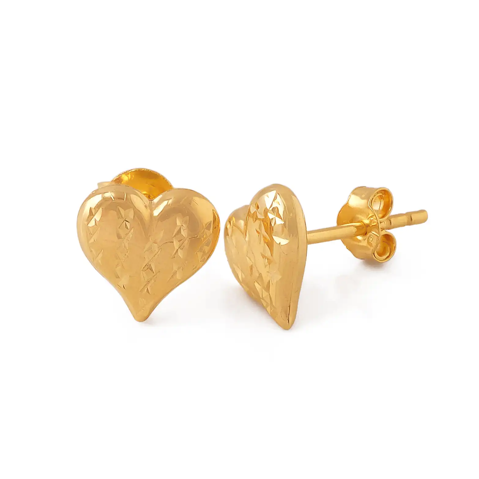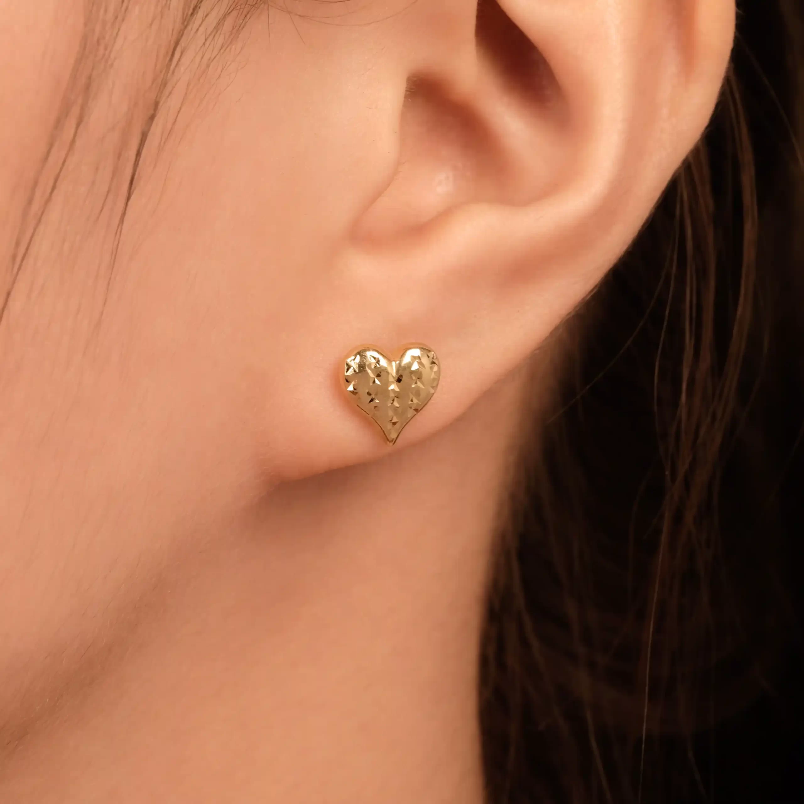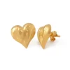 18 karat Italian gold heart stud earrings with textured surface by Oro China Jewelry.